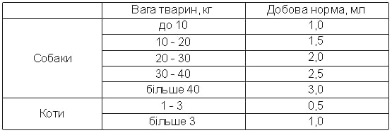 Засіб давати тваринам перорально в ранкове годування з невеликою кількістю корму або примусово за допомогою шприца - дозатора 1 раз на добу, у наступних дозах: